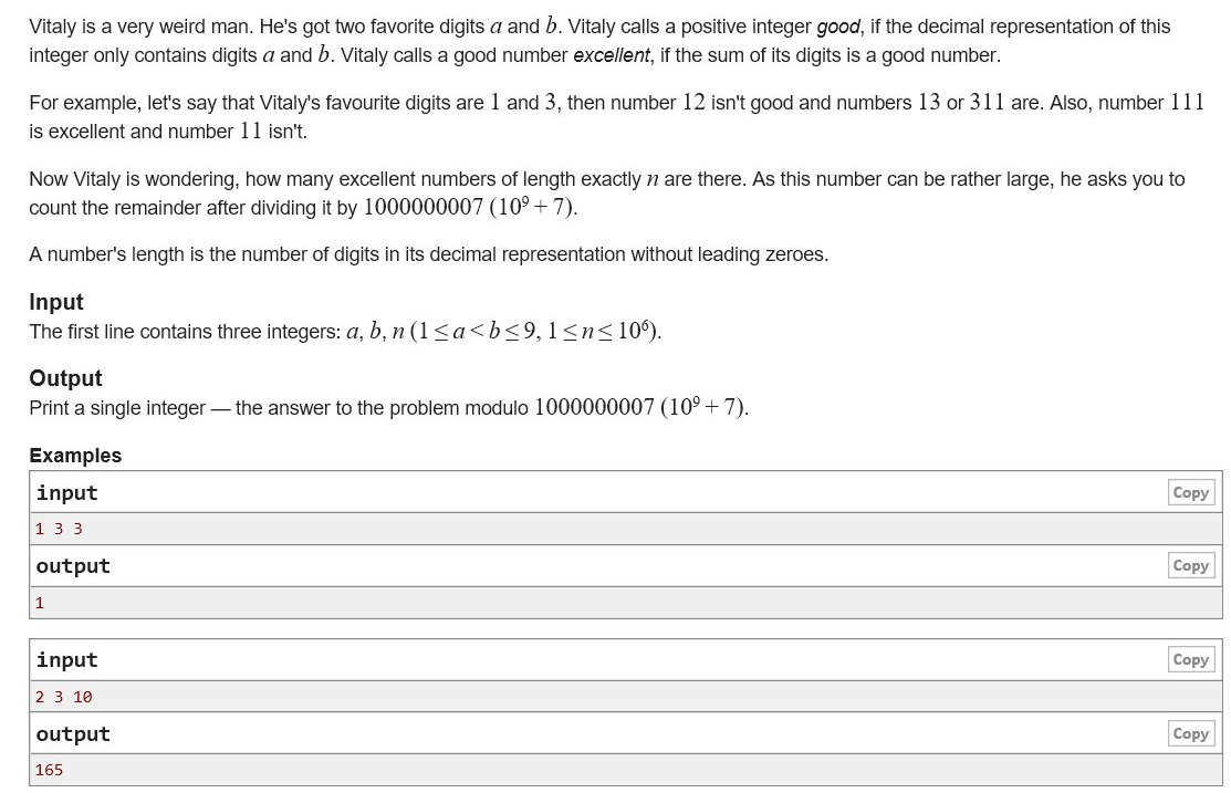 总共n位,假设数字有x位a,那么要有(n-x)位b,才是好的数字,然后算出来和,如果每一位都是a,b,那么答案加上C(n,x).