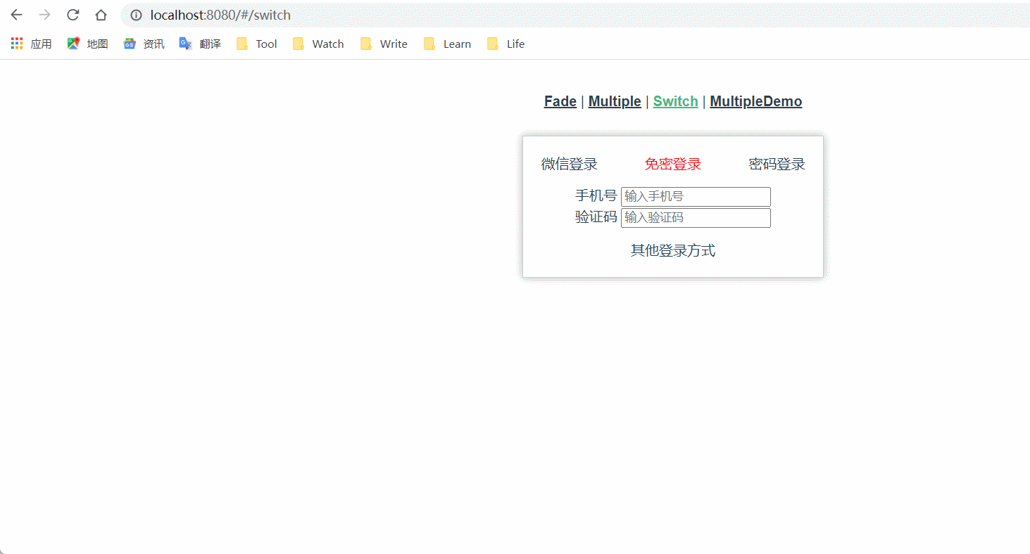 看完动图,你会发现我点击微信登录与密码登录的时候,地址栏并没有变化,上面的 Fade、Multiple、Switch、MultipleDemo是通过 router-link 跳转的路由导航,相当于 a 超链接标签,所以路由地址发生了变化,懂了吧。