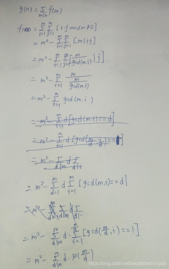 Count a * bTime Limit: 2000/1000 MS (Java/Others) Memory Limit: 262144/262144 K (Java/Others)Total Submission(s): 1571 Accepted Submission(s): 523 Problem Description Marry likes to count the number of ways to choose two non-negative integers a and b less than m to make a×b mod m≠0 .Let's denote f(m) as the number of ways to choose two non-negative integers a and b less than m to make a×b mod m≠0 . She has calculated a lot of f(m) for different m , and now she is interested in another function g(n)=∑m|nf(m) . For example, g(6)=f(1)+f(2)+f(3)+f(6)=0+1+4+21=26 . She needs you to double check the answer.
