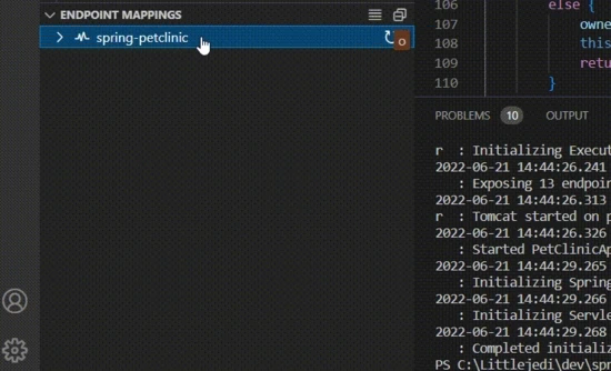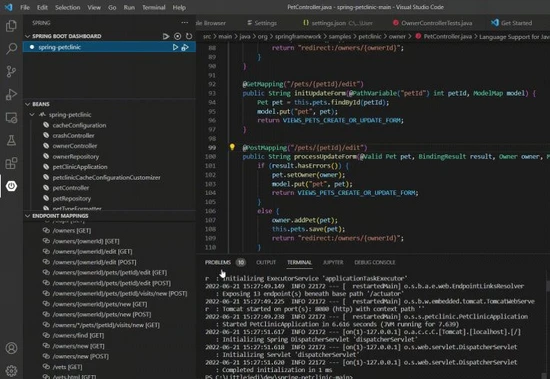我们为 Spring 开发者带来了一些好消息!微软一直在与 VMWare 合作,以完善 Spring Boot Dashboard的可视化体验。过去,Dashboard主要用于启动应用程序。然而,我们意识到这还不够。作为 Spring 开发者,我们经常处理 Bean 和 REST API 映射。因此,我们决定将这两个概念引入Spring Boot Dashboard插件中,并将插件引入单独的视图中(如下图所示)