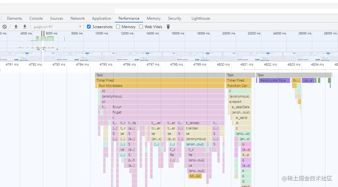 复制代码 另外,有些服务的web页面,本身响应就非常的慢,这是由于业务逻辑复杂,前端JavaScript本身就执行缓慢。这部分代码优化,就需要前端的同事去处理了,如图,使用chrome或者firefox的performance选项卡,可以很容易发现耗时的前端 代码。
