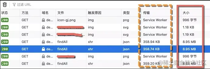 通过在chrome的inspect中查看请求的数据,我们发现一个关键的请求接口,每次要传输大约10MB的数据。这得塞了多少东西。