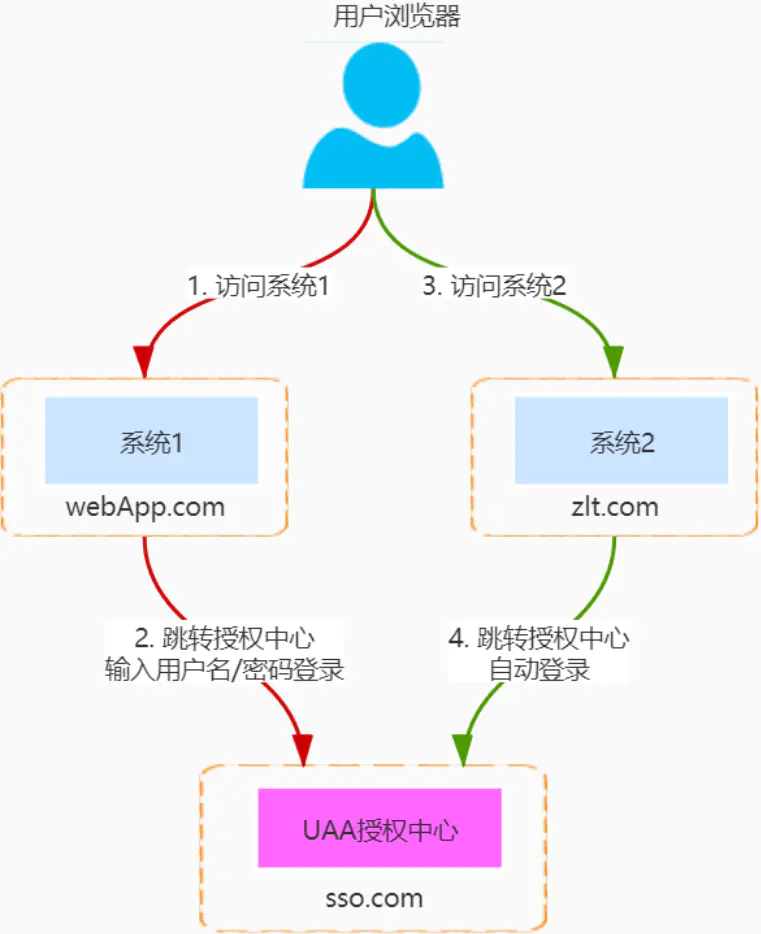 举个例子:有两个系统分别是:应用1(webApp.com)和应用2(zlt.com)需要实现单点登录,另外有一个UAA授权中心(sso.com),实现架构如下: