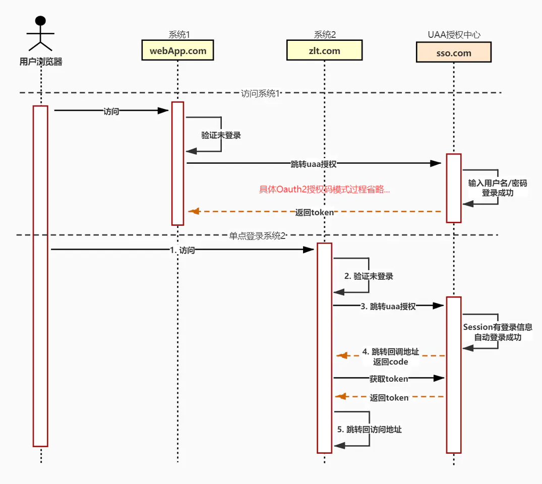 下图是访问 sso客户端 时 @EnableOAuth2Sso 注解与 UAA授权中心 通过 Oauth2授权码模式 交互完成单点登录的步骤