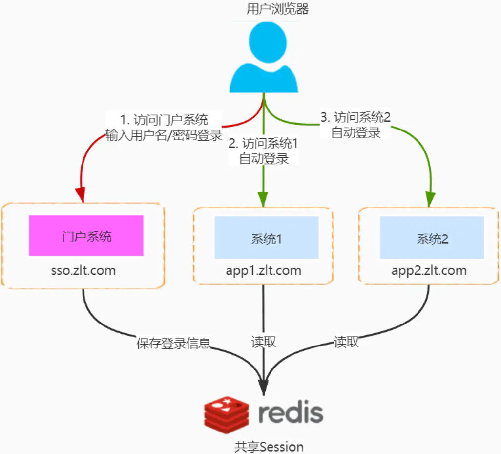 举个例子:公司有一个一级域名为 zlt.com ,我们有三个系统分别是:门户系统(sso.zlt.com)、应用1(app1.zlt.com)和应用2(app2.zlt.com),需要实现系统之间的单点登录,实现架构如下: