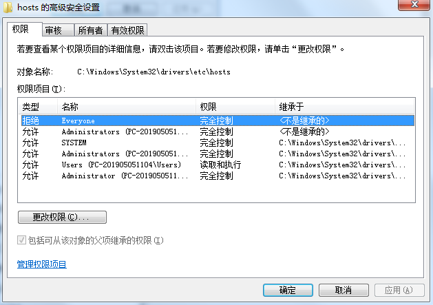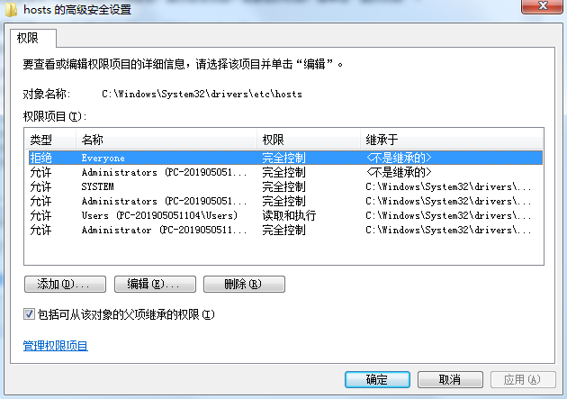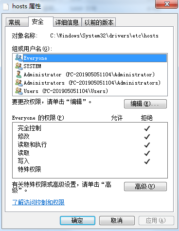 双击Everyone,修改权限,这样hosts文件就可以修改了。