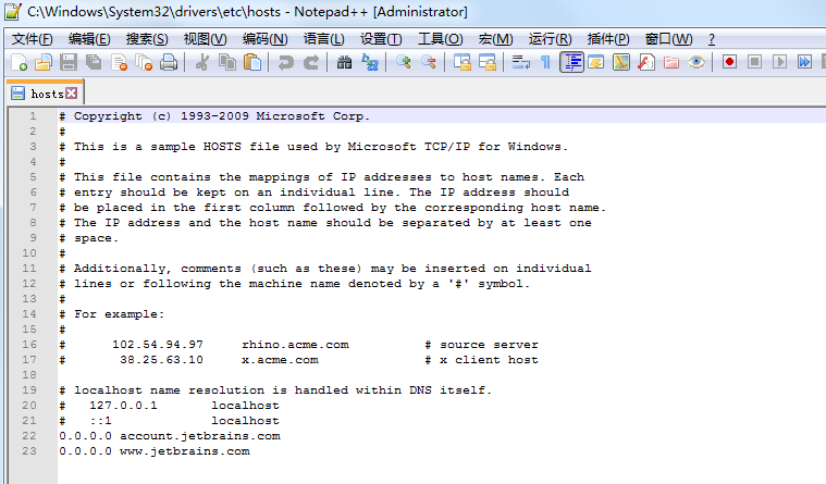 在正式使用注册码之前,请将“0.0.0.0 account.jetbrains.com”和“0.0.0.0 www.jetbrains.com”添加到hosts文件中,