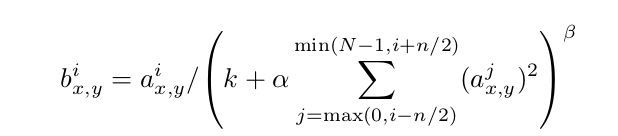 尽管 ReLU 不会遇到输出饱和的问题,但是作者仍然发现局部响应归一化有助于网络的泛化。设定 ax,yi 为位置 (x,y) 处第 i 个卷积核的响应,那么归一化后的响应 bx,yi 为: