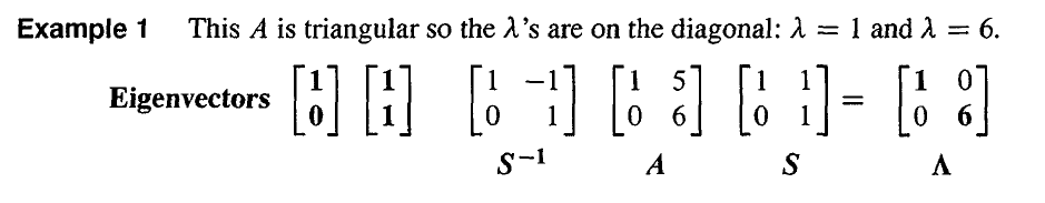- 如果特征值 λ1,⋯,λn 全部都不相同,那么自动地特征向量 x1,⋯,xn 就是线性不相关的。任意没有重复特征值的矩阵都可以被对角化。