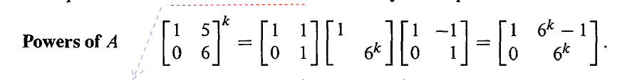 由 A=SΛS−1 可得, A2=SΛS−1SΛS−1=SΛ2S−1,平方后我们得到** S 中相同的特征向量和 Λ 中平方的特征值**。同理,我们可以得到 k 次方为 Ak=SΛkS−1。