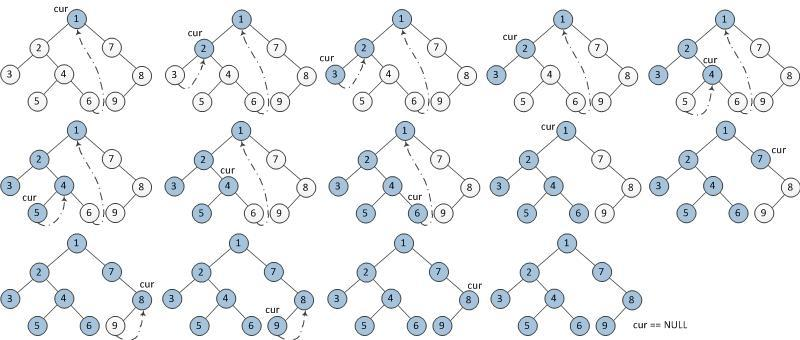 - b) 如果前驱节点右孩子为当前节点,当前节点指向其右孩子,前驱节点右孩子设为空(恢复原有树结构)