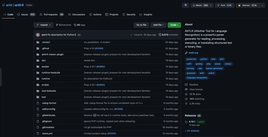 Antlr 使用 Java 语言实现,支持 Java、C#、JavaScript、Python、Go、C++、Swift 等编程语言,目前在 Github 上收获了 12k+ Star。