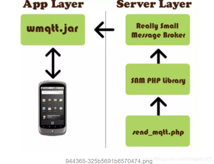 原理:基于Push方式,wmqtt.jar 是IBM提供的MQTT协议的实现,原理如下图: