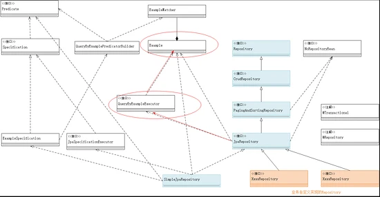 - 先看下蓝色的部分其实就是Repository的一整个接口定义链条,而橙色的则是我们自己自定义的一些Repository接口类,继承父层接口的所有已有能力。