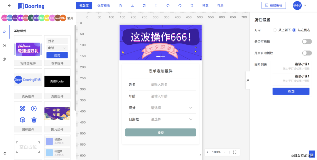 以上教程笔者已经集成到H5-Dooring中,对于一些更复杂的交互功能,通过合理的设计也是可以实现的,大家可以自行探索研究。