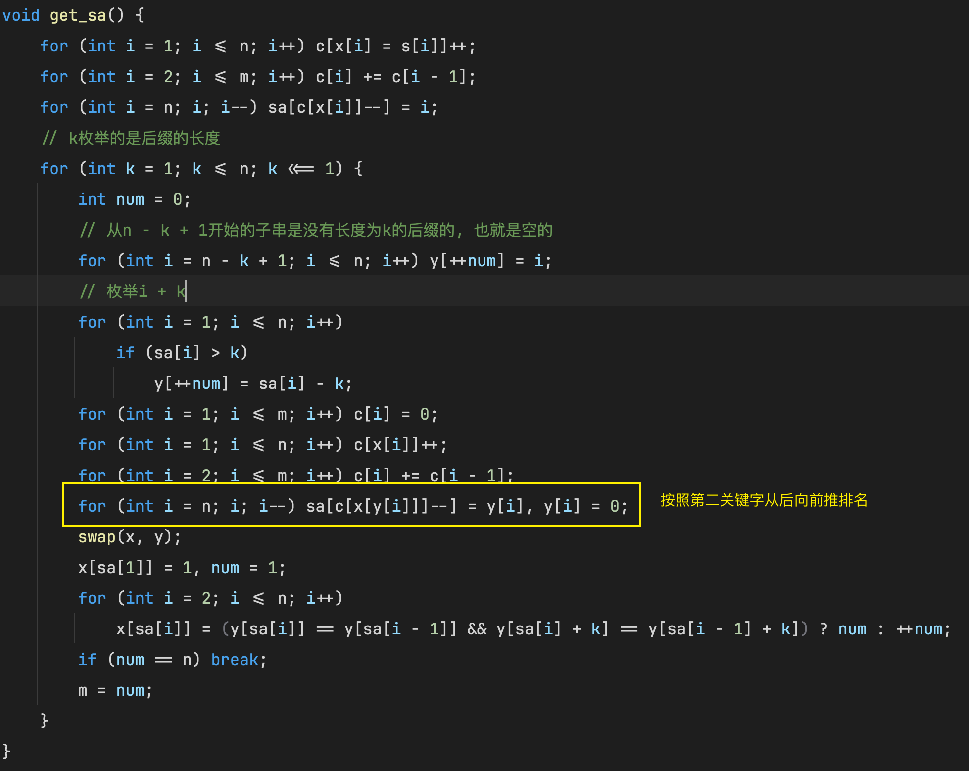 s a ( i ) sa(i) sa(i)个后缀的第二关键字是 s a ( i + k ) sa(i + k) sa(i+k)后缀的第一关键字