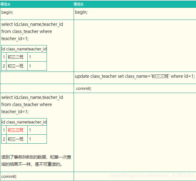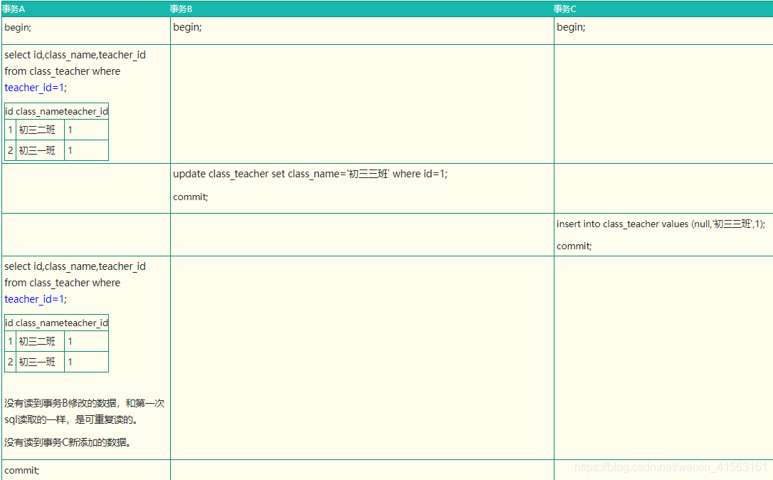 我们注意到,当teacher_id=1时,事务A先做了一次读取,事务B中间修改了id=1的数据,并commit之后,事务A第二次读到的数据和第一次完全相同。所以说它是可重读的。那么MySQL是怎么做到的呢?这里姑且卖个关子,我们往下看。