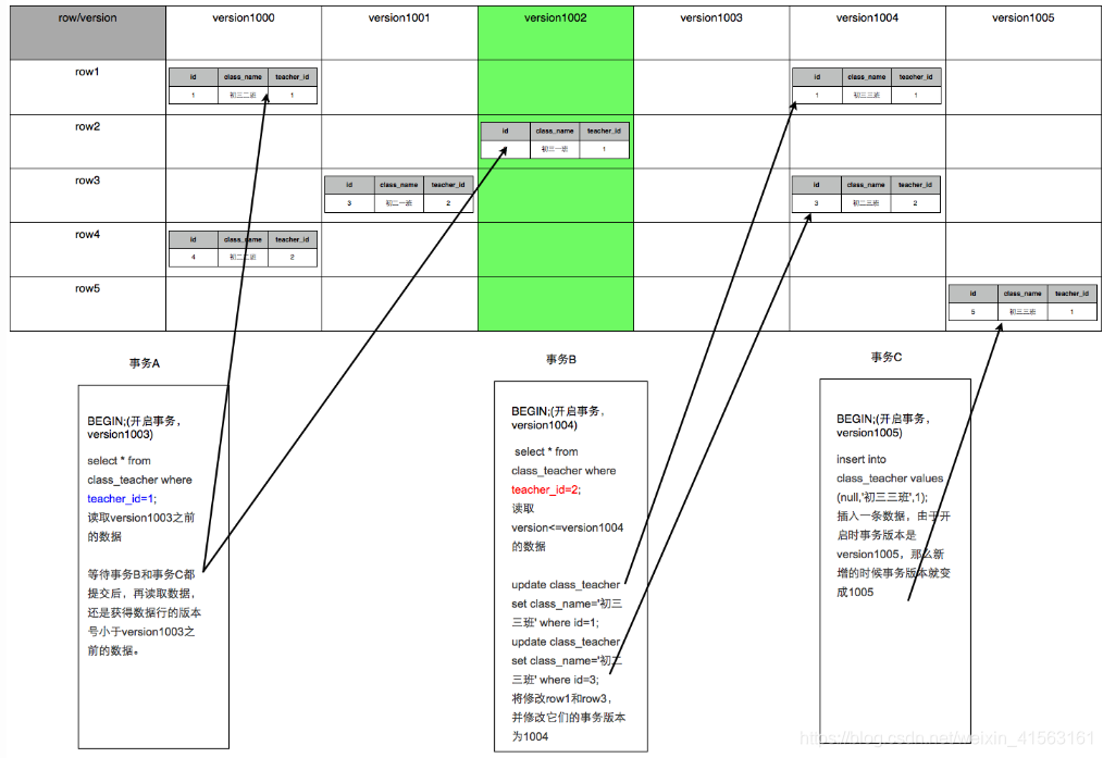 - DELETE时,保存当前事务版本号为行的删除版本号