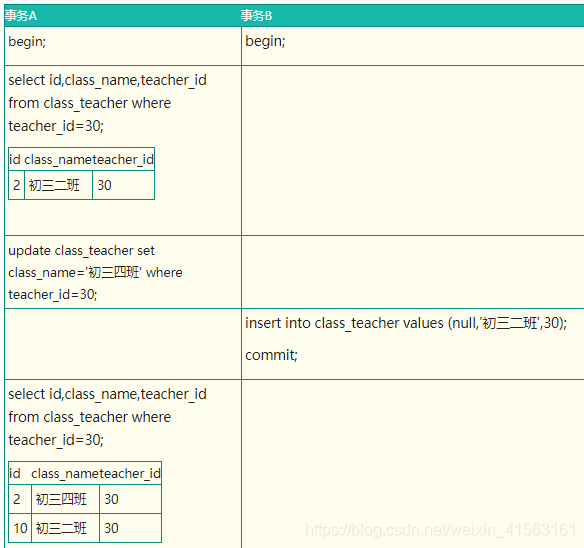 通过对比我们可以发现,在RC级别中,事务A修改了所有teacher_id=30的数据,但是当事务Binsert进新数据后,事务A发现莫名其妙多了一行teacher_id=30的数据,而且没有被之前的update语句所修改,这就是“当前读”的幻读。