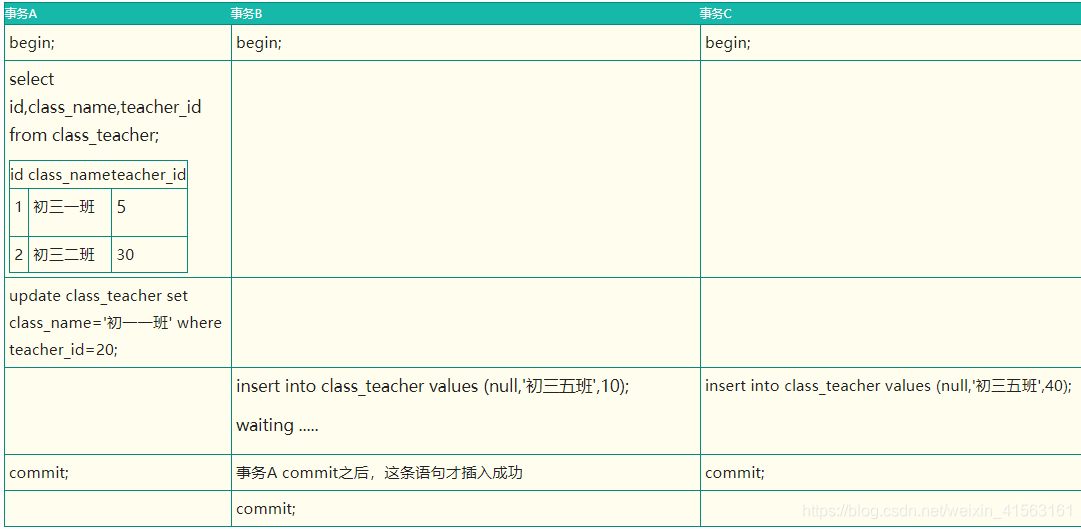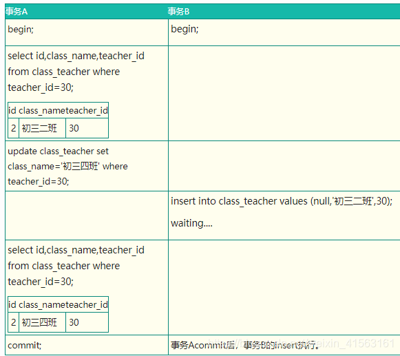 为了防止并发过程中的修改冲突,事务A中MySQL给teacher_id=1的数据行加锁,并一直不commit(释放锁),那么事务B也就一直拿不到该行锁,wait直到超时。