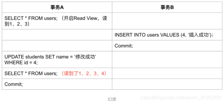如果users表中有id为1、2、3共3条记录,事务A先读,事务B插入一条记录并提交,事务A更新被插入的记录是可以成功的,因为UPDATE是进行当前读,更新时可以读到id为4的记录存在,因此可以成功更新,事务A成功更新id为4的记录后,将在id为4的记录版本链上新增一条事务A的版本,因此事务A再次SELECT,就可以名正言顺地读到这条记录,符合Read View规则,但产生了幻读。