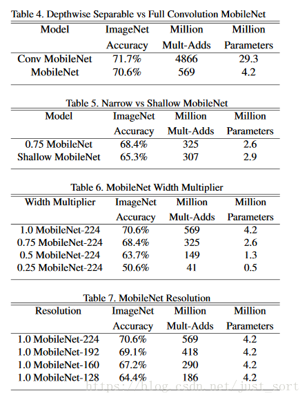 首先,我们展示了具有深度可分离卷积的MobileNet与使用完整卷积构建的模型相比较的结果。在表4中,我们看到,与完全卷积相比,使用深度可分离的卷积在ImageNet上只会将精度降低1%,但在mult-adds和参数方面节省了巨大的成本。