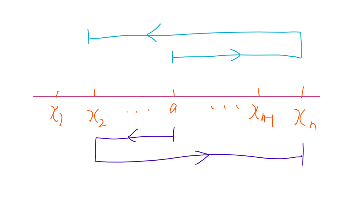 首先将数据排序,则两端的点距离最远肯定要舍弃一个,访问 n−1 个点只有两种情况, x1→xn−1或者x2→xn。假设访问的点是 x2→xn,则又有下图两种访问顺序,先右后左或者先左后右,距离分别为 dis1=2∗(xn−a)+(a−x2) 和 dis2=2∗(a−x2)+(xn−a)。