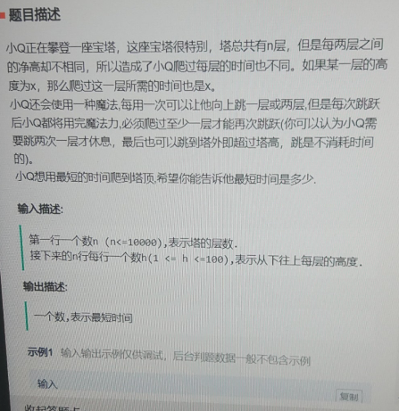 第一,从 i−2 层跳两层过来,根据题意,跳之前我们肯定爬过了一层(不可能连续跳两次),也就是从第 i−3 层爬到了第 i−2 层,然后再跳到第 i 层,这时候,需要的时间即为 S[i]=S[i−3]+data[i−3],注意此处, data[i−3]是数组的第 i−2 个元素,代表第 i−2 层的高度。