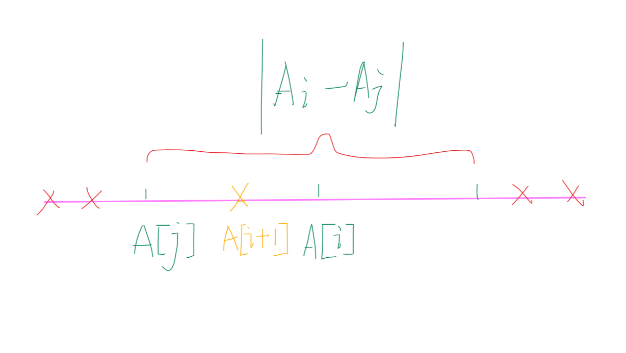 - 若 A[i]⩽A[i+1]⩽A[j],则排除掉左右两边的点;