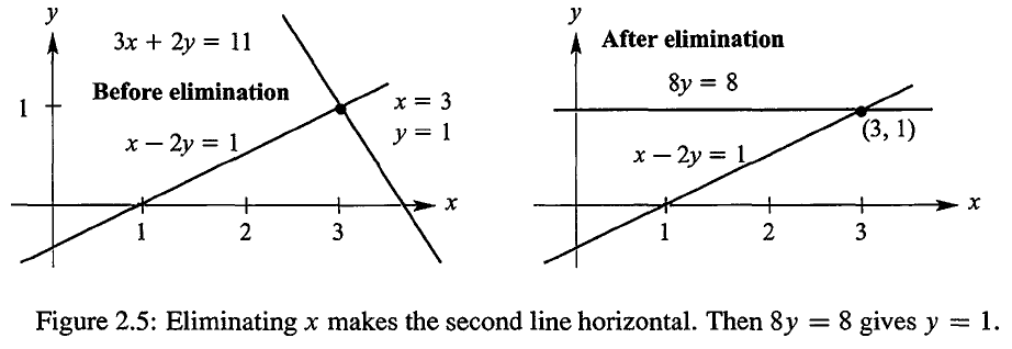 可以看到,消元之后,方程组变成了一个下三角(upper triangular)的形式,然后我们就可以用回带法(back substitution)来快速地解出方程组的解。