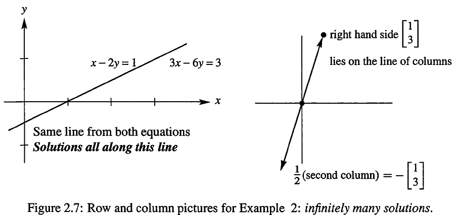 从行图像中,我们也可以看到,两条直线相同,因此整条直线都是交点。而在列图像中,左边的两个向量和右边的向量方向都相同,有无穷多个线性组合都可以产生右边的向量。