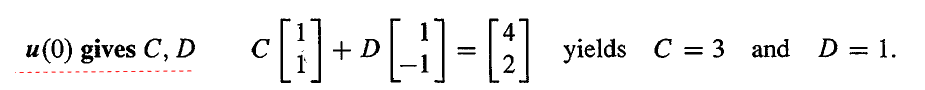 注意,这里 A 是常矩阵,不随时间而改变。而且这些方程是线性的,如果 u(t) 和 v(t) 都是方程组的解,那么它们的线性组合 Cu(t)+Dv(t) 也是解,我们需要 n 个这样的常数来匹配方程组的初始条件。