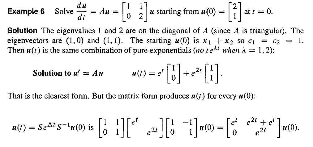 其中一个解是 eλtx, λ 是矩阵 A 的特征值,而 x 是特征向量。将这个解代入原方程,利用 Ax=λx 可得