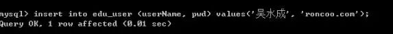 mysql> insert into edu_user (userName, pwd) values('吴水成', 'roncoo.com');