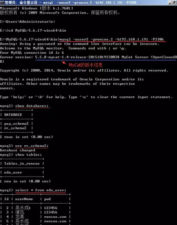 E:MySQL-5.6.17-winx64in>mysql -uuser2 -proncoo.2 -h192.168.1.191 -P3306