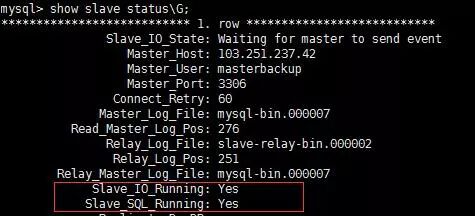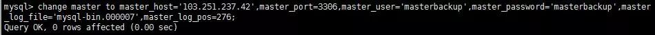 change master to master_host='103.251.237.42',master_port=3306,master_user='masterbackup',master_password='masterbackup',master_log_file='mysql-bin.000007',master_log_pos=276;