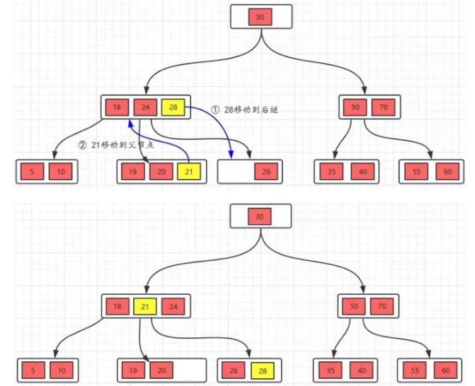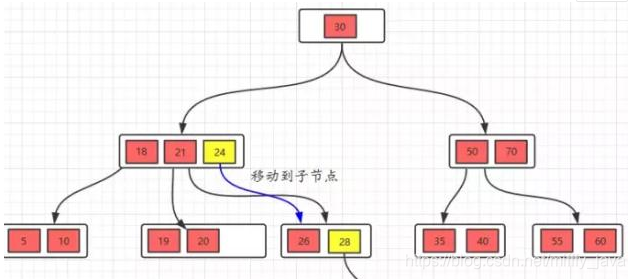 此时发现26所在的节点只有一个元素,小于2个(m/2),这个节点不符合要求,这时候的规则(向兄弟节点借元素):如果删除叶子节点,如果删除元素后元素个数少于(m/2),并且它的兄弟节点的元素大于(m/2),也就是说兄弟节点的元素比最少值m/2还多,将先将父节点的元素移到该节点,然后将兄弟节点的元素再移动到父节点。这样就满足要求了。
