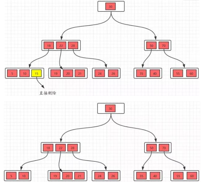 - 删除15,这种情况是删除叶子节点的元素,如果删除之后,节点数还是大于m/2,这种情况只要直接删除即可。
