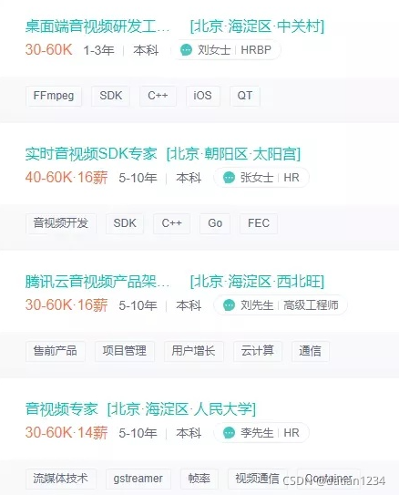 音视频开发的前景,相信大家从相关的招聘网站上就可以看到,不管是流媒体开发还是音视频处理开发,都是大量招人的,并且由于入门门槛相对较高,学习周期长,薪资也是居高不下。