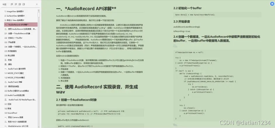 创建一个数据流,一边从AudioRecord中读取声音数据到初始化的buffer,一边将buffer中数据导入数据流。